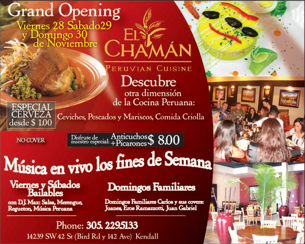 El Chamán Peruvian Cuisine de Walter y Marienella Kopp, el restaurante peruano más elegante de Miami. Ubicado a 2.5 millas al oeste de la Turnpike, en el área de Kendall Lake, en la 14239 SW 42nd Street, Miami, Florida.